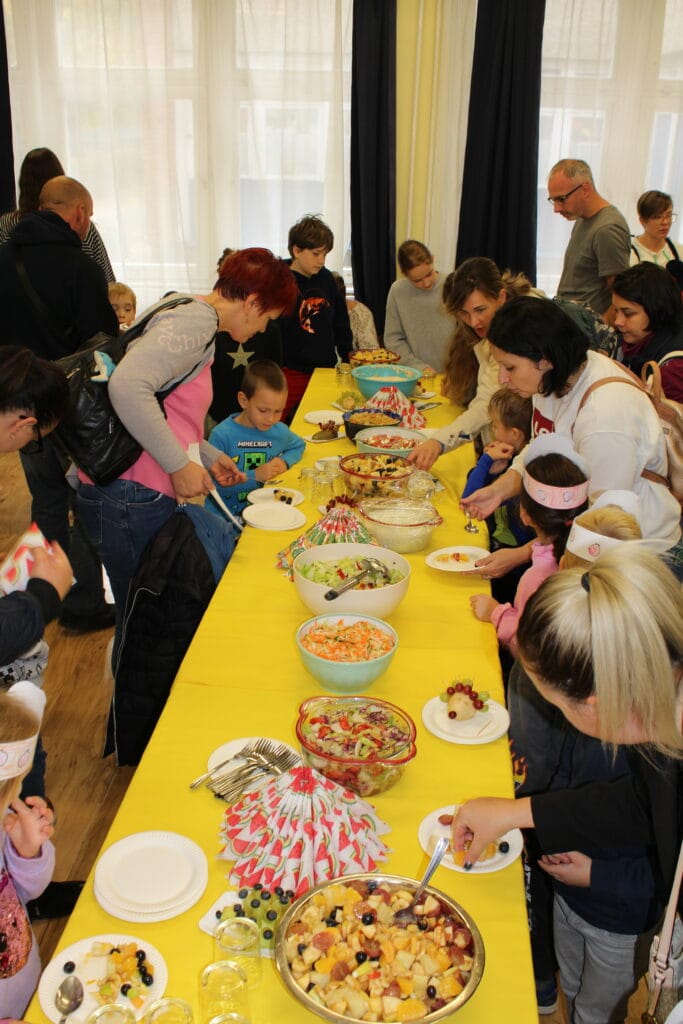 A rendezvény fénypontjaként a táncteremben egészséges ételeket kóstolhattak meg a résztvevők, miközben megcsodálhatták az osztályok által készített gyönyörű és kreatív gyümölcs szobrokat. 🎨🍇